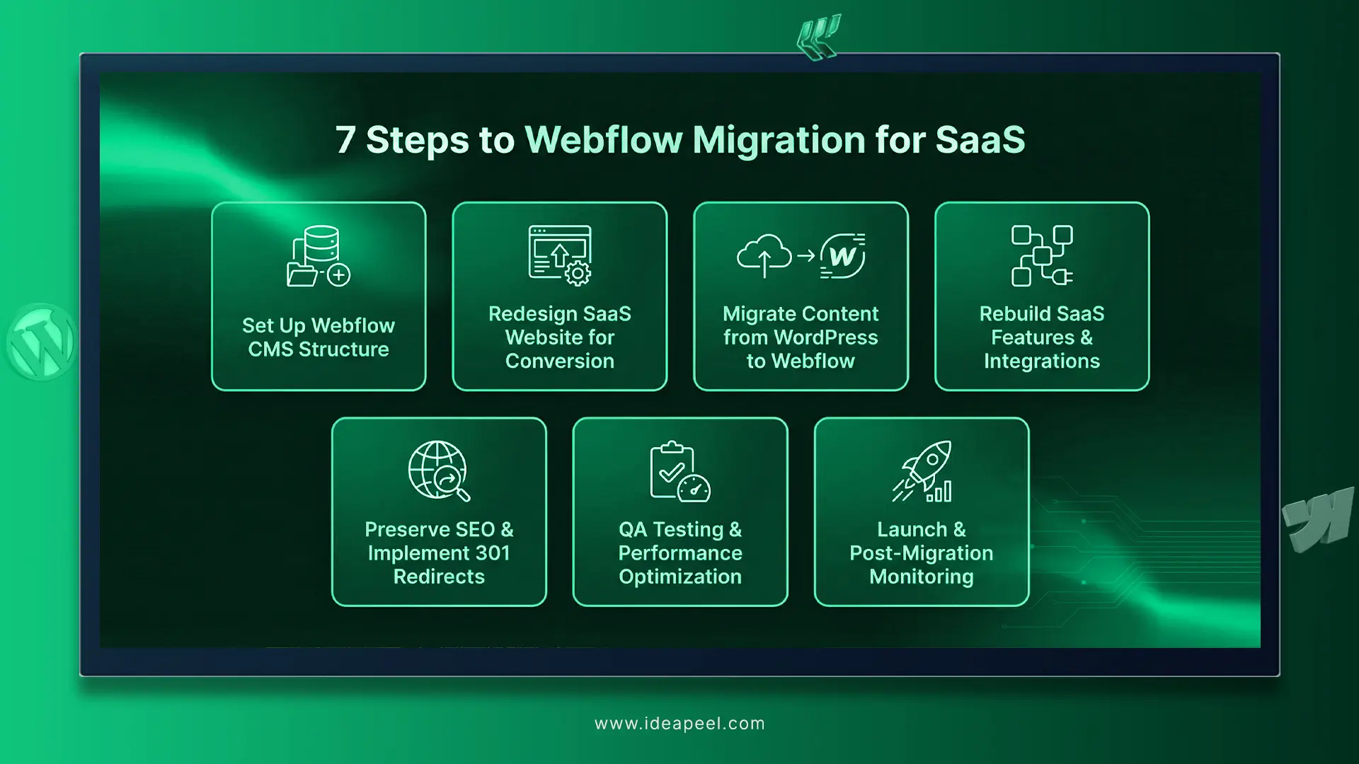This guide explains an SEO-safe WordPress to Webflow migration, common mistakes to avoid, and a clear Webflow checklist. So your SaaS site can move safely while gaining speed, scalability, an easy CMS, and full design control.